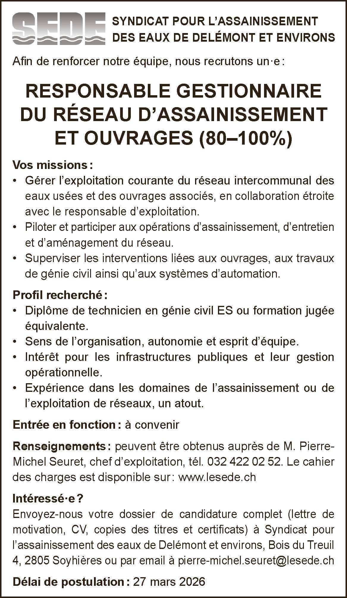 Le syndicat pour l'assainissement des eaux de Delémont et environs (SEDE) est à la recherche d'un-e collaborateur/trice en tant que responsable gestionnaire du réseau d'assainissement et ouvrages (80-100%).